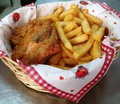 Arroz, papas fritas y una presa de pollo, todo en una sola bandeja. Una porción perfecta para una persona con buen apetito.