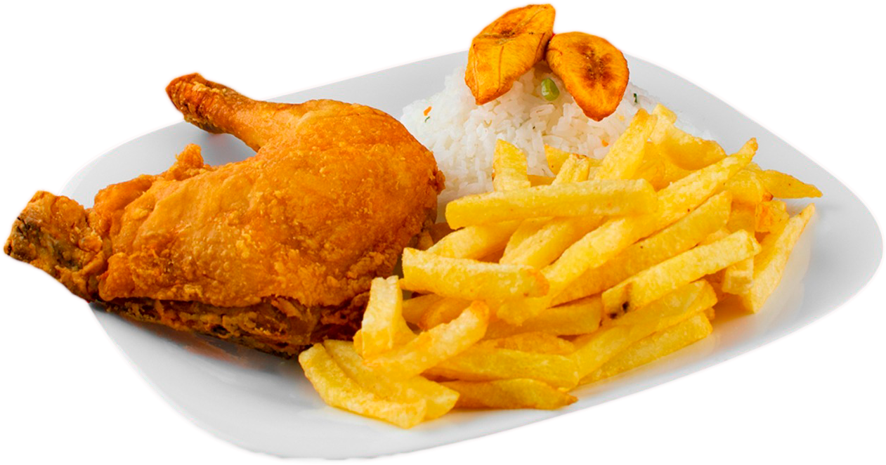 El favorito para disfrutar en familia. 1/2 pollo dorado con arroz y papas fritas. Plato completo y generoso.