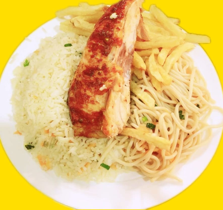 Combinación completa con 1/4 de pollo, arroz, papas fritas y fideos. Plato servido en porción individual.