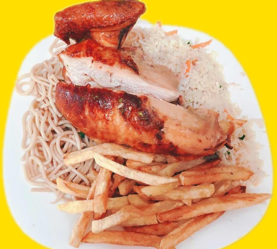 El favorito para disfrutar en familia. 1/2 pollo dorado, con arroz, papas fritas y fideos. Plato completo y generoso.