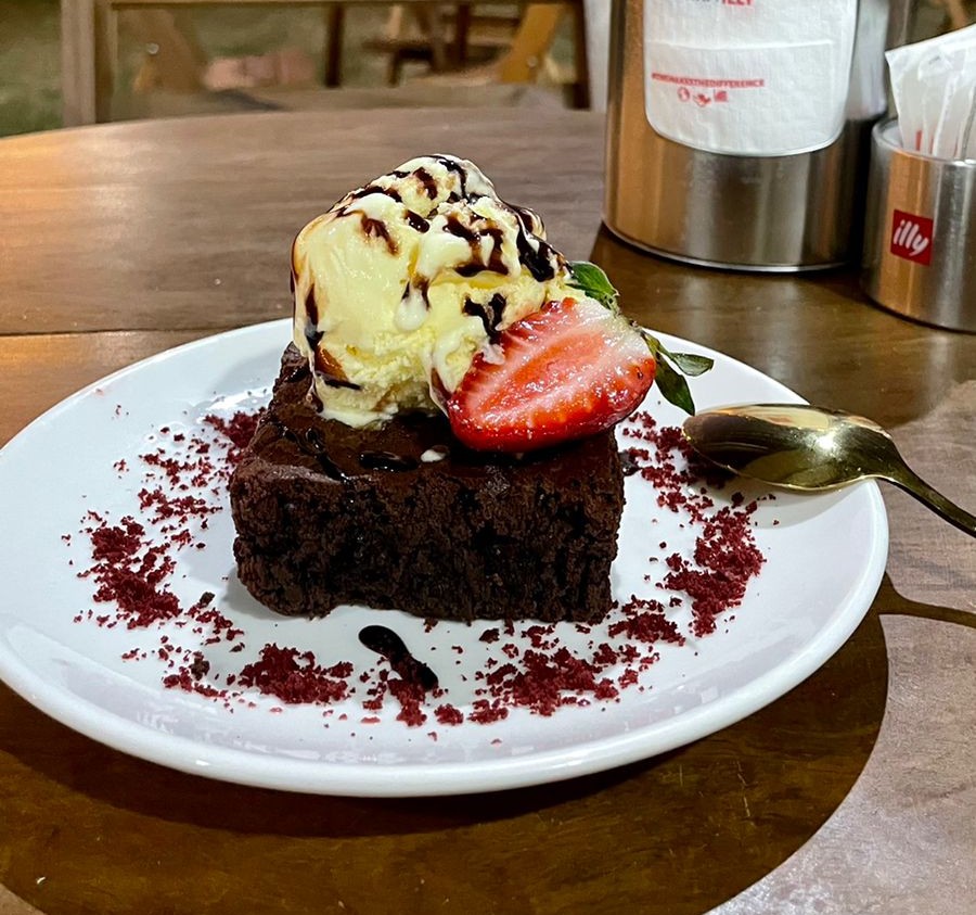 Brownie servido con helado, dulce y delicioso.