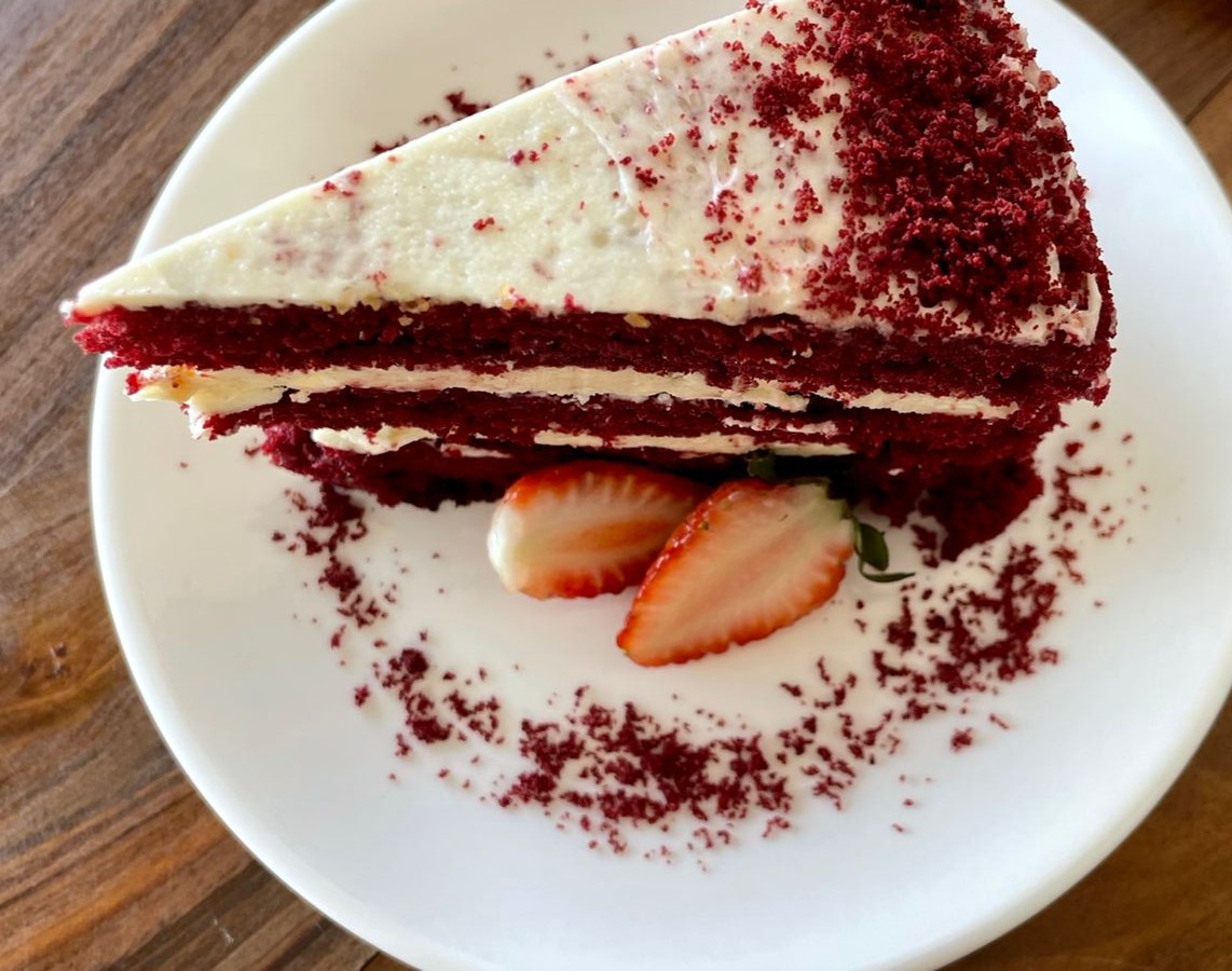 Porción de torta Red Velvet, suave y deliciosa.