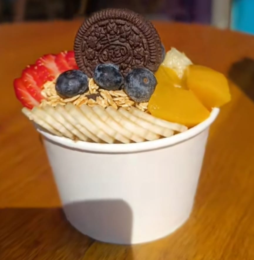 Barco de asai con frutas y crema, presentación especial y deliciosa.
