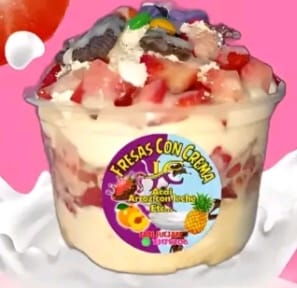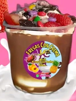 Fresas mixtas con crema y leche condensada, suaves y cremosas.