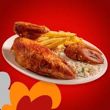 El favorito para disfrutar en familia. 1/2 pollo dorado con arroz y papas fritas. Plato completo y generoso.